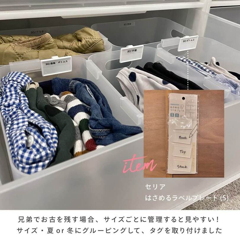シーズンやサイズごとにボックスに分けて入れ、セリアの「はさめるラベルプレート」を使ってすぐにわかるようにしています。