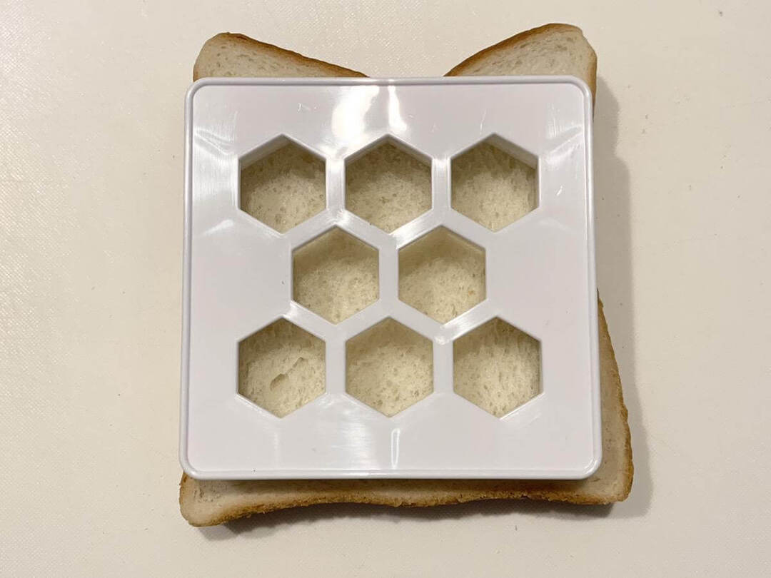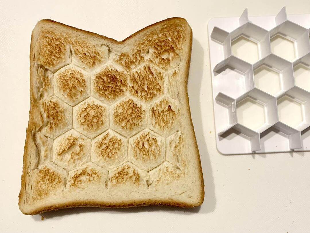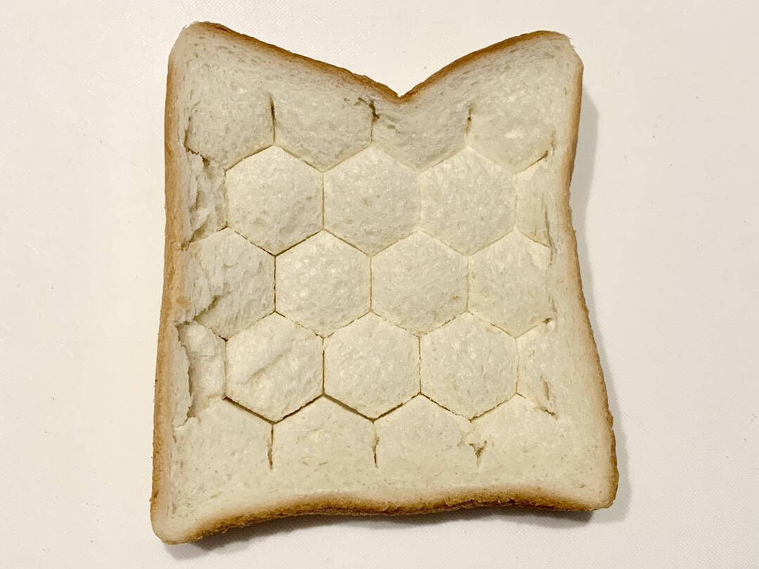 トースターで焼いてみると、焦げ目のおかげで六角形がさらにきれいに浮き上がって見えます。これだけでも十分おいしそう…。