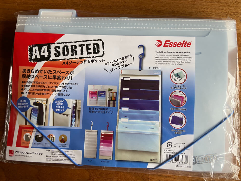 紹介するのはコストコの文房具売り場で販売されている「エセルテ ソーテッドファイル A4 5ポケット」です。A4サイズのファイルにハンガーがついていて壁に吊るせます。