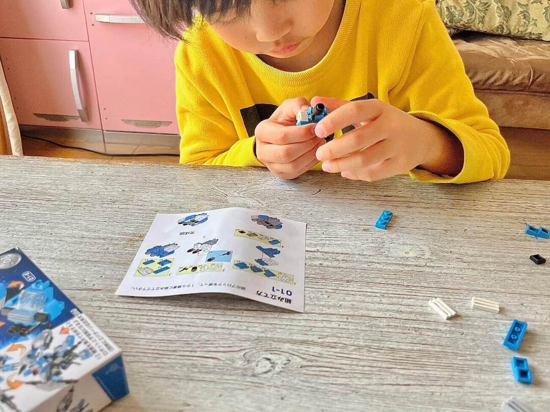 1つ完成させるのにかかった時間は5〜10分程度で、私が作り方を助言することなく完成させられていたので、難易度的には小学生にちょうどよさそう。ただ、ブロック自体が細かく合体させにくい部分は多少あったようで、一部手伝う場面もありました。