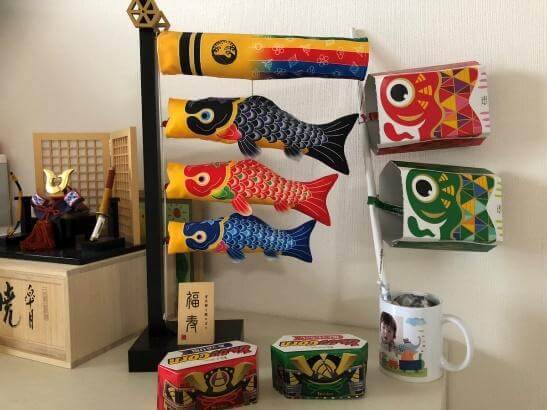 輪っか状にして竿に引っ掛け、2カ所ホッチキスで止めればできあがりです。できあがったこいのぼりは子どもの記念マグカップにさして、家に元々あったこいのぼりのオブジェの隣に飾りました。うん、いい感じです♪