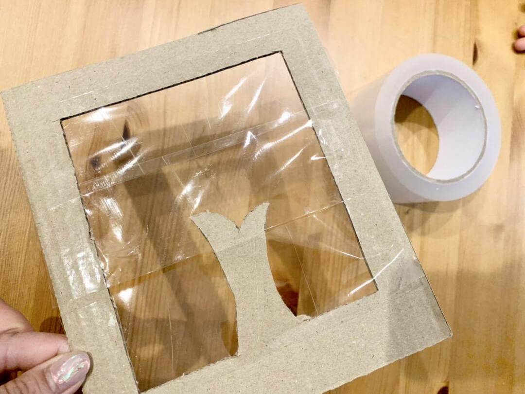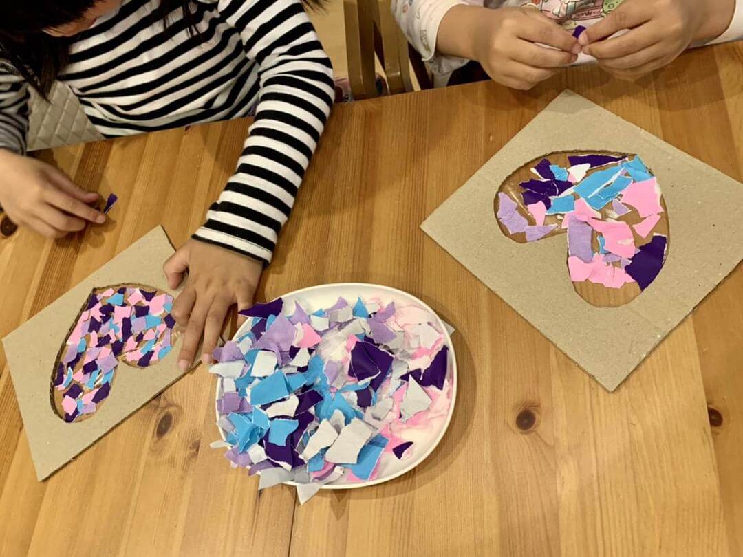 親が段ボールの枠さえ用意してしまえば、あとは子どもたちにおまかせできたので、真剣に貼っている間に、私は夜ごはんの支度をすませることができました(笑)