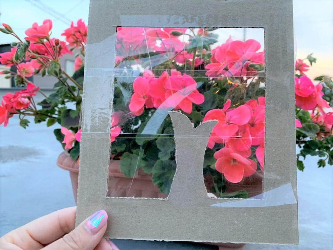 どの花で作ろうか…段ボールの枠越しに子どもと一緒に考えるのも楽しいですよ。まるで絵本の『わたしのワンピース』みたい。