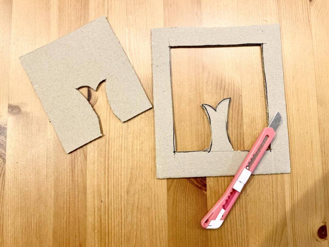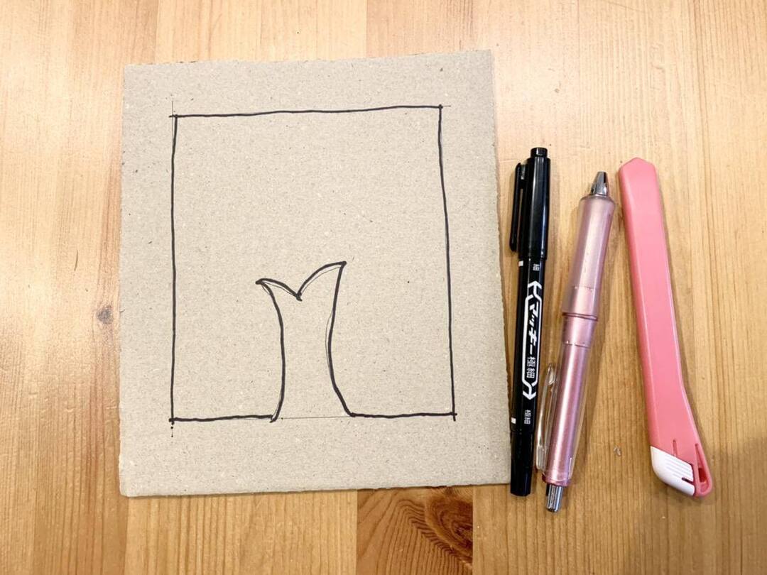 段ボールで花をのせる枠を作ります。今回は木の幹を描きました。線に沿ってカッターを入れていきましょう。
