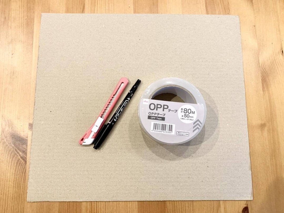 用意するのは、段ボールと100均でも売られている梱包用のOPPテープ。あとはマジックやカッターです。少し薄めの段ボールのほうが、カットしやすいのでおすすめ。