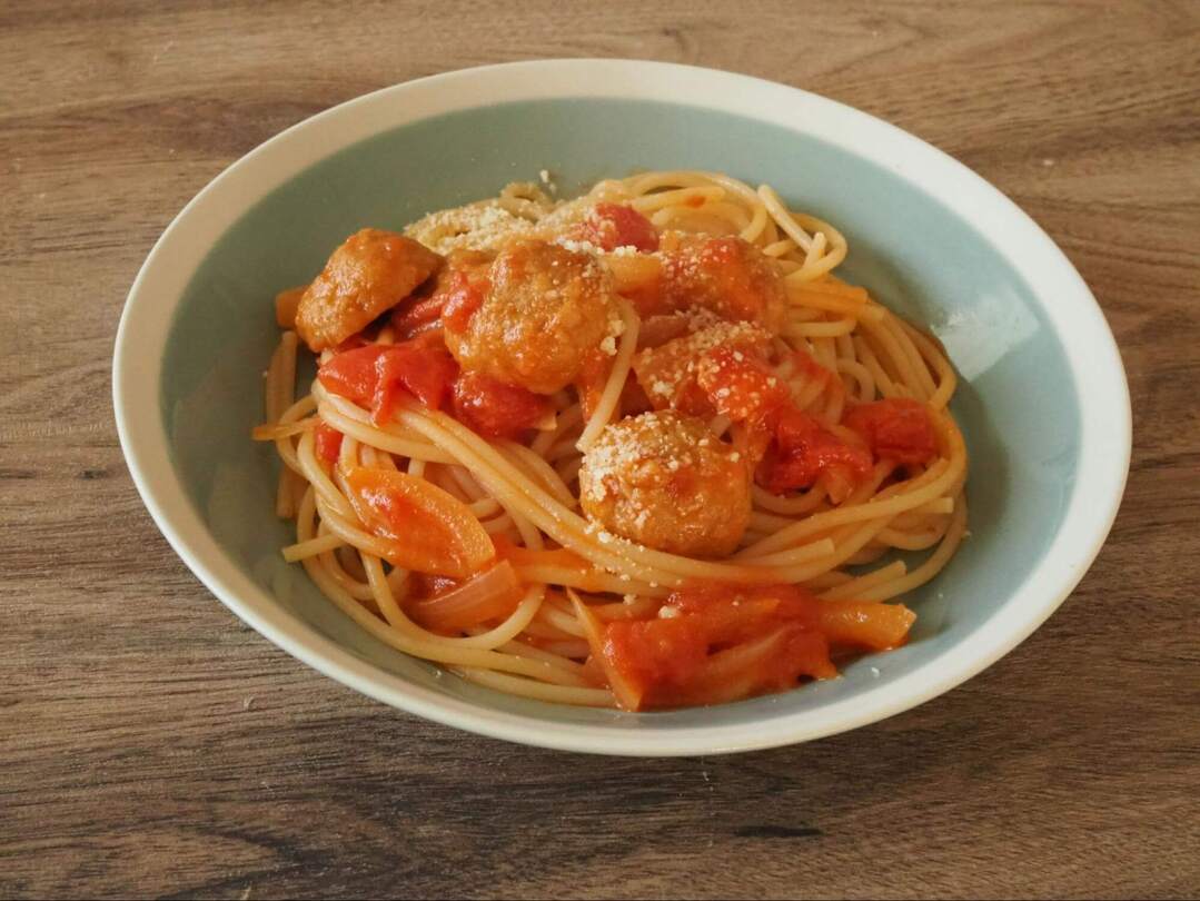 肉だんごは子どもが好きなトマトパスタの具にもぴったり!食べ応えたっぷりのパスタになりますよ。