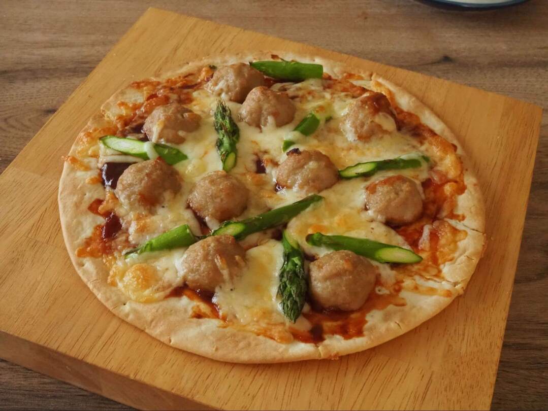 市販のピザクラフトにピザソースを塗り、肉だんごと野菜、チーズをのせたらオーブンやトースターで焼くだけ!