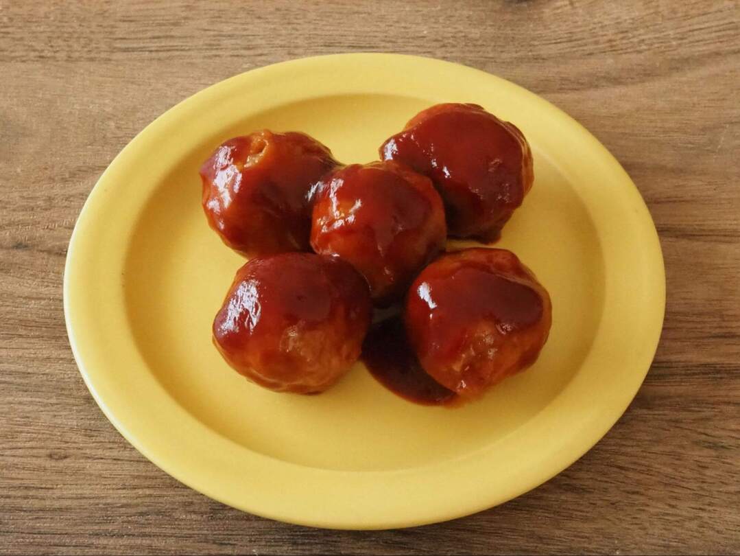 あらかじめ電子レンジで解凍しておいた肉だんごを、酒とケチャップ、ソース(すべて同量)を入れて煮立てた鍋に入れて、さっと絡めるだけ。鶏肉が主原料の肉だんごなので、冷めても固くなりにくく、お弁当のおかずにもぴったりです。