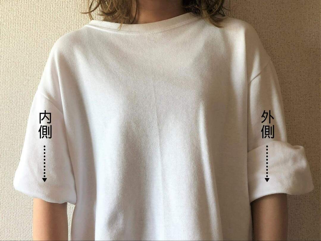 なんと、袖を「内側」に折り曲げるだけ!これだけで、「ずり落ちてこない袖」が完成します。