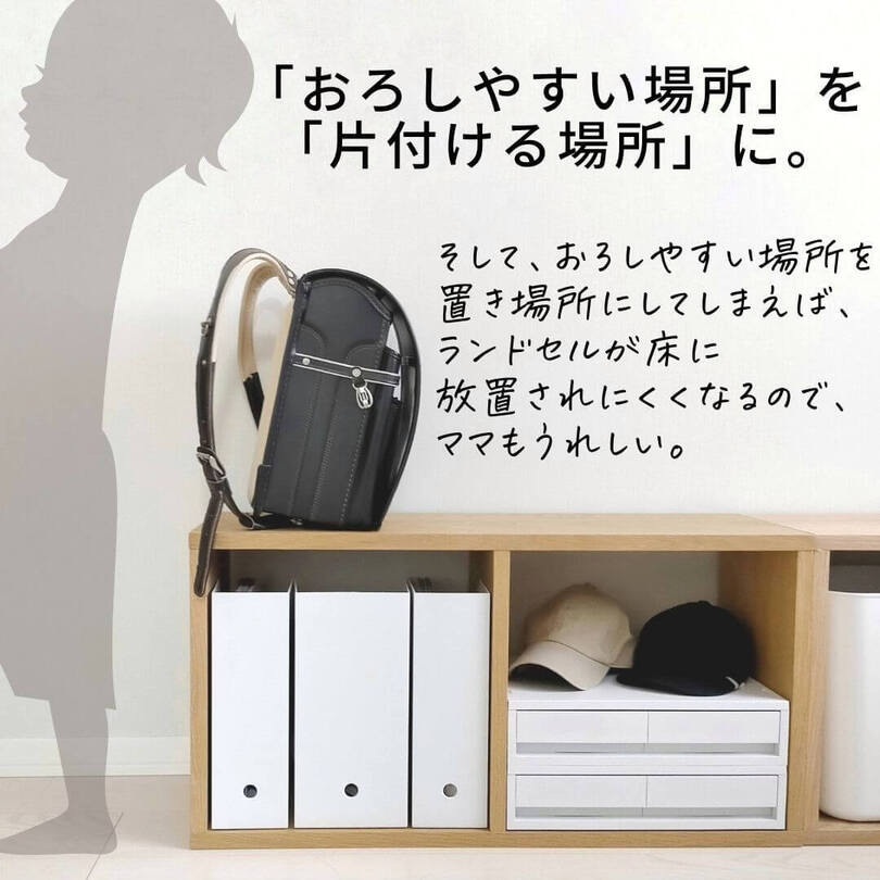 小学生のママ・パパなら一度はイラッとしたことがある「ランドセル床に置きっぱなし問題」。それを防止するためにhanamizukiさんが考えたのが、低い棚に載せる出しっぱなし収納。