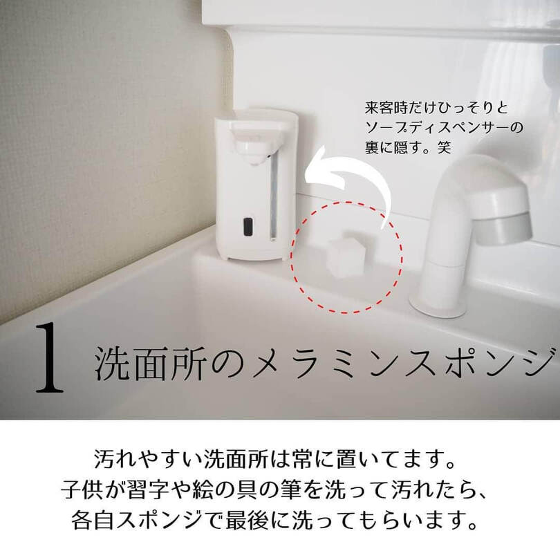 整理収納アドバイザー大森智美さんの出しっぱなしアイデアは、掃除グッズ。洗面所にはいつでもサッと掃除できるようにメラミンスポンジを。