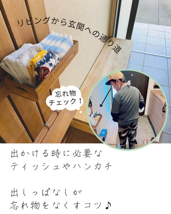 毎日必要だけど、意外と忘れがちなハンカチやティッシュは玄関へ行く途中の、目に入りやすい場所に出しっぱなしに!家を出るまでの間で自然に目に入るようにすることで、忘れ物を防げます。