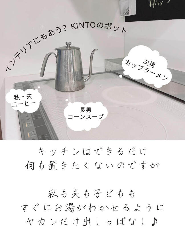 家族みんなが使うヤカンはシンプルなデザインで、出しっぱなしにしていても気にならないものをチョイス。