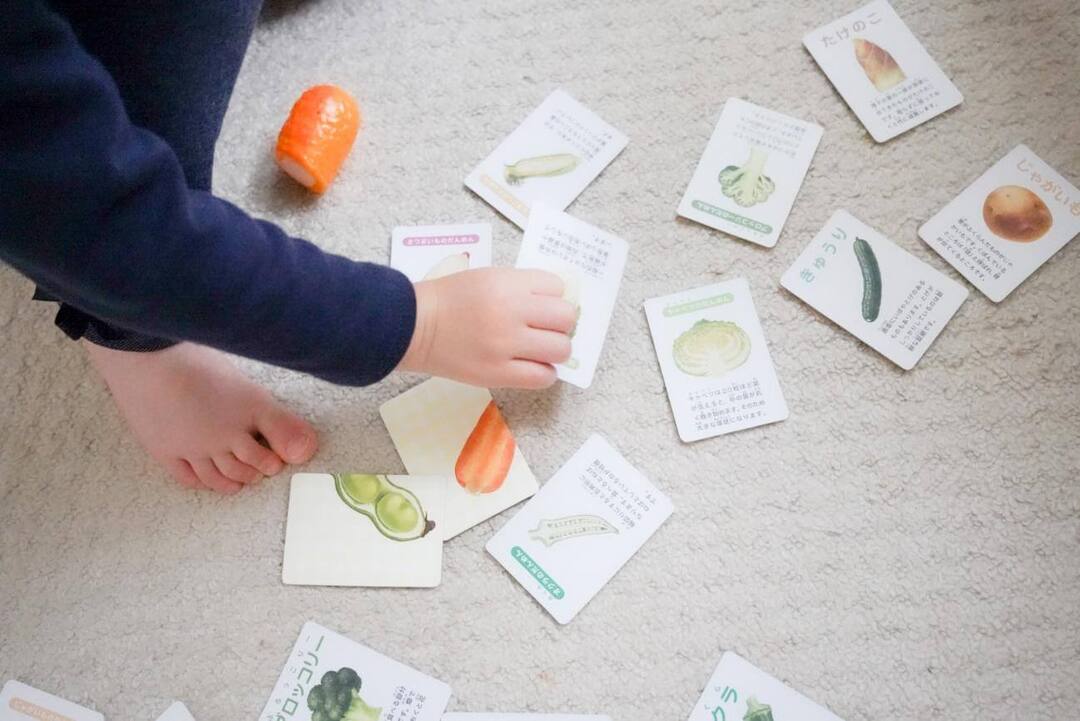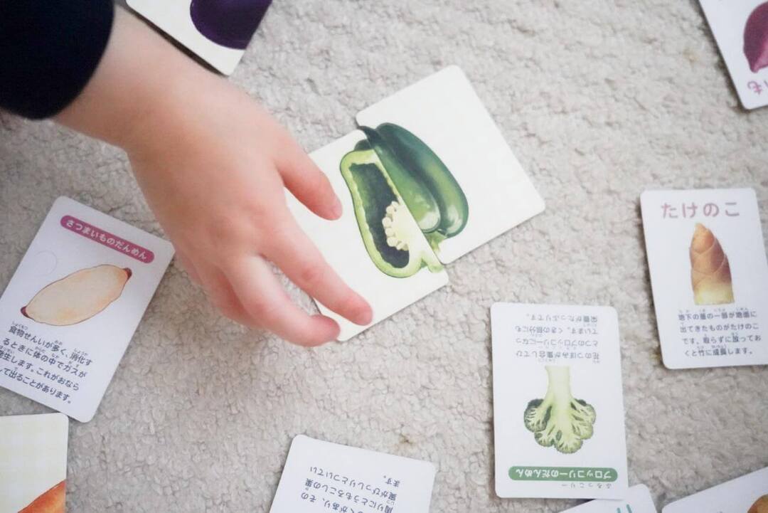 そのうち「ピーマンが2つあるよ」と気づいて、自分からくっつけて遊ぶように。裏面の豆知識は、ひとつ読んで聞かせると次々に「これ読んで」と渡してくるほど気に入ったようです♪
