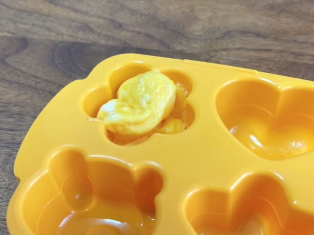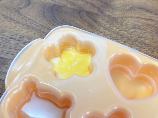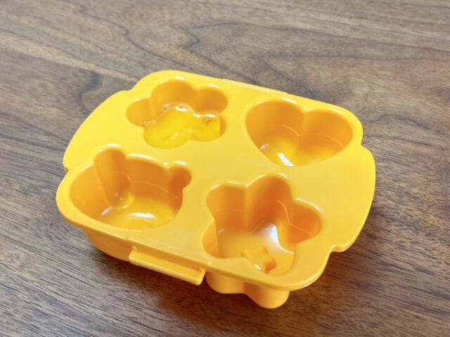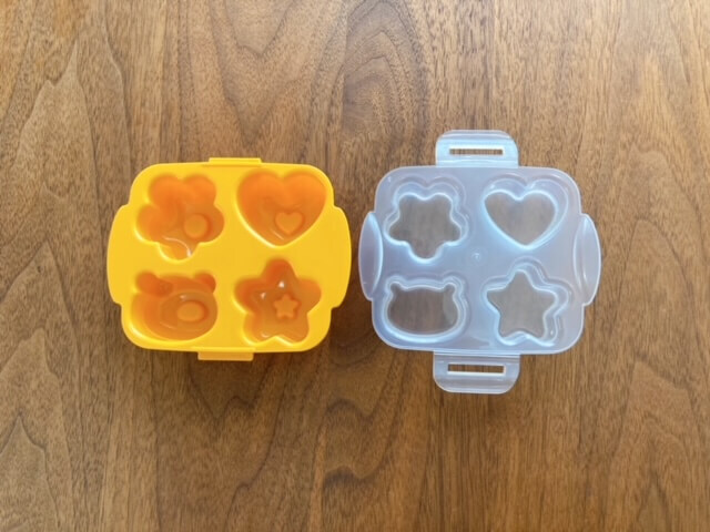 卵液を流し込む型とふたのセットです。お花、星、ハート、くまの4種類のミニ卵焼きが電子レンジ加熱でできるとのこと!さっそく作ってみましょう。