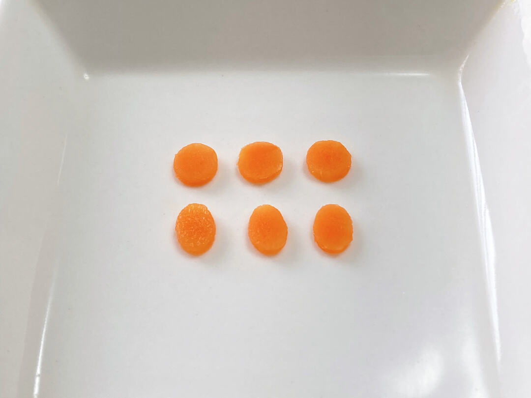 電子レンジで加熱したにんじんのスライスを抜いてみたところ、とてもきれいに抜けました!人や動物などのお顔、お花を作るのにぴったりです。