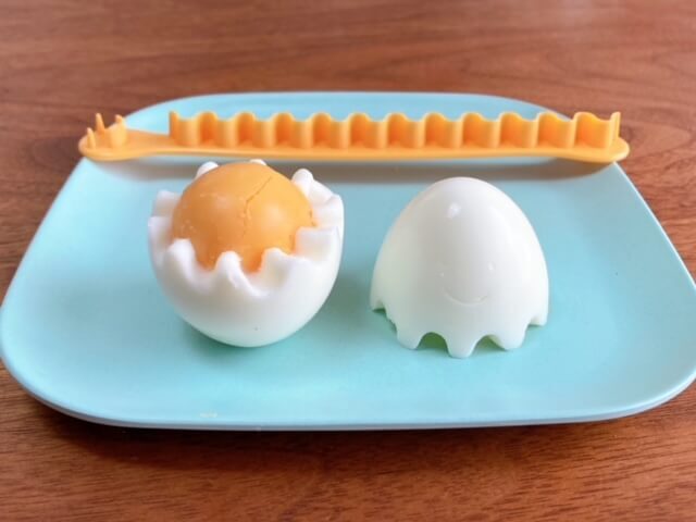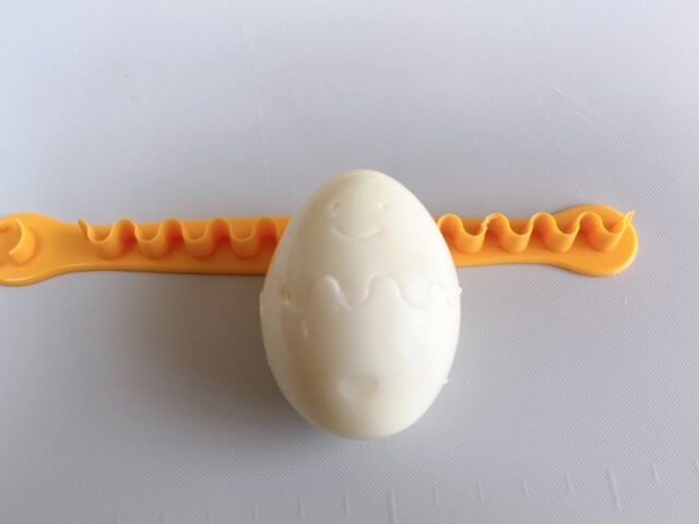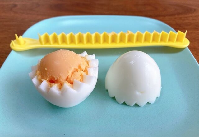 ギザギザでゆで卵の白身部分だけをカットする道具ということで、不思議な形ですね。片側の端は顔になっていて、卵に押しつけると目と口を作ることができるんだそう。