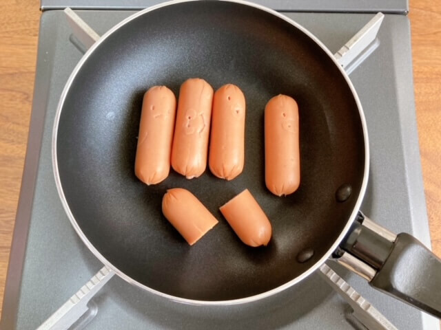 こうしたウインナーなどのお弁当おかずに火を通すときに便利なのが、ダイソーの14cmサイズのフライパン!