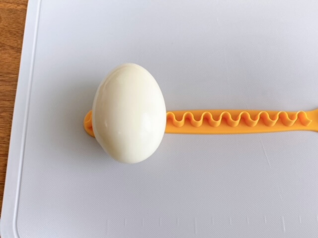 ゆで卵を転がして型に押し付けるときの力加減が難しく、弱いと白身が切れないし、強いと黄身が崩れてしまいます。また、ゆで卵の黄身が片寄っていてもきれいにできないので、ゆでる時から気が抜けません。