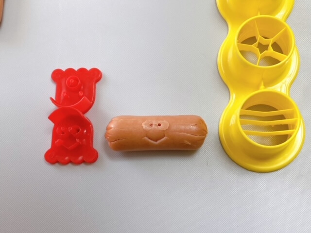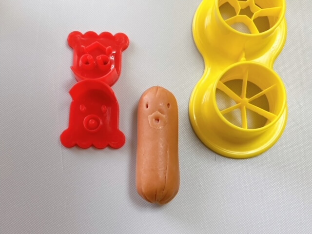 こちらはタコ。写真右の黄色い型にウインナーを刺して足を作り、顔は赤い型に押しつけます。