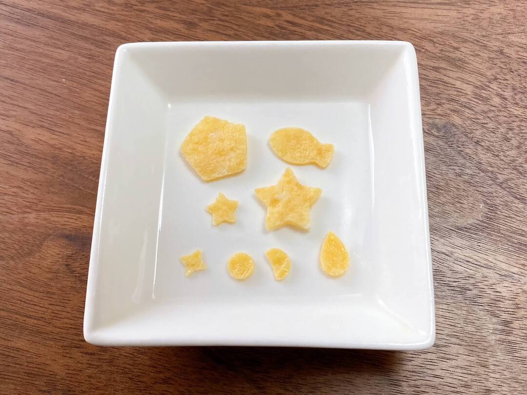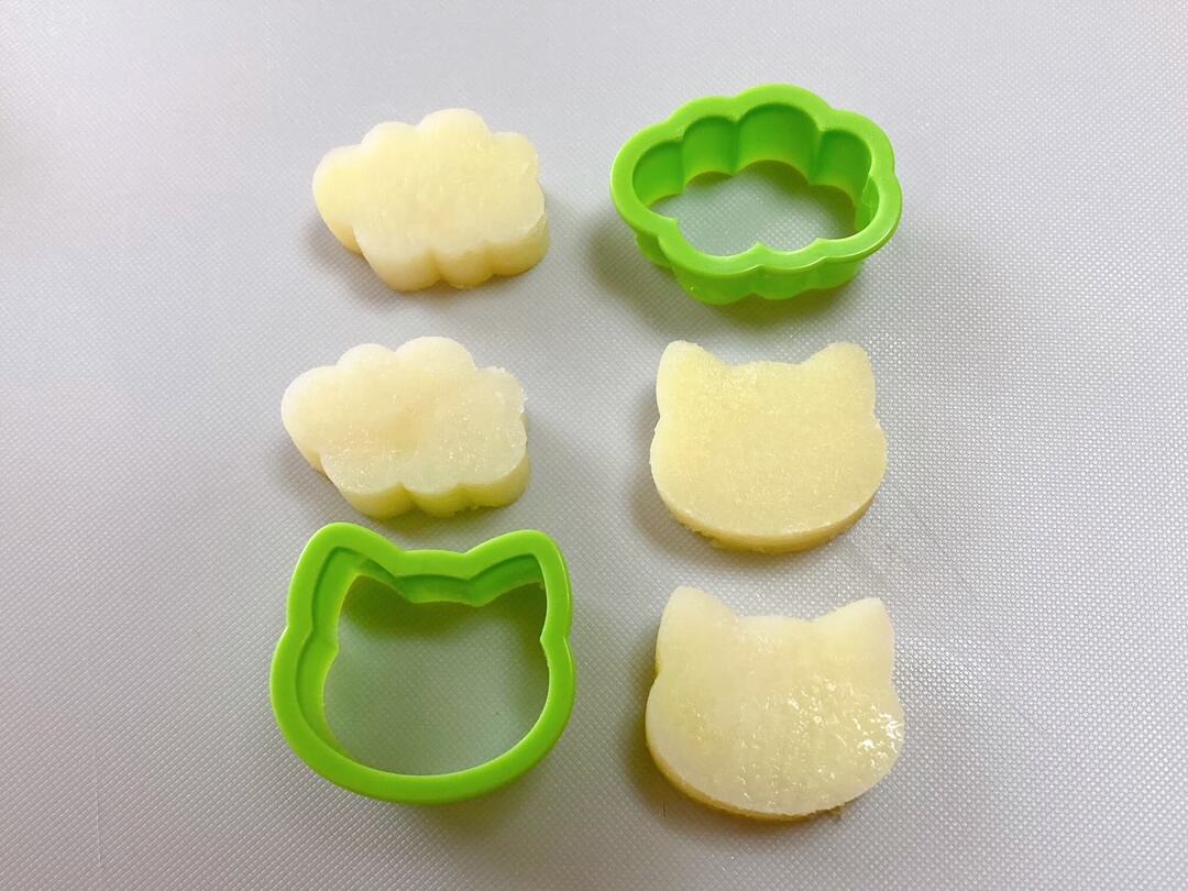 大きめの抜き型を使って、じゃがいもを1cmくらいに切って電子レンジで少し柔らかく加熱したものを抜きました。