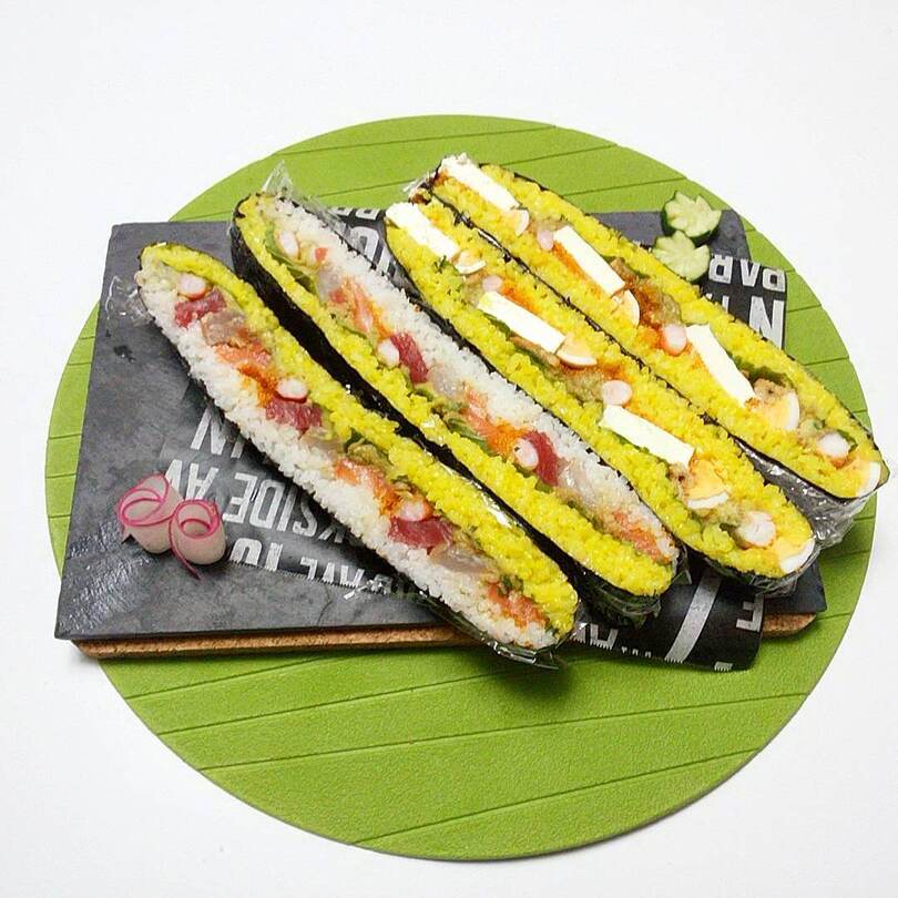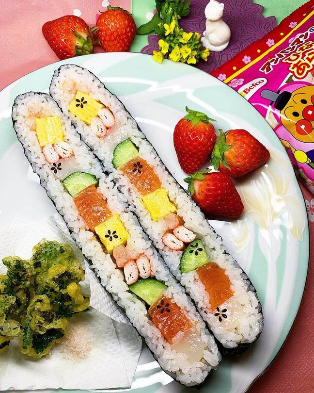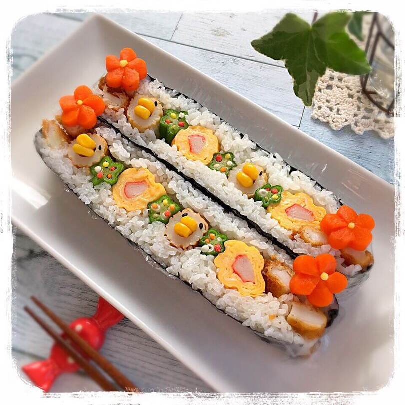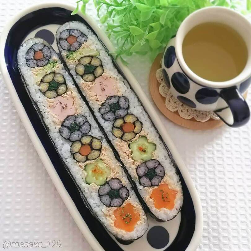 masakoさんはお花の「飾り巻き寿司」をおにロングにサンド!飾り巻き寿司だけでもかわいいですが、並べるとさらに映えますよね。