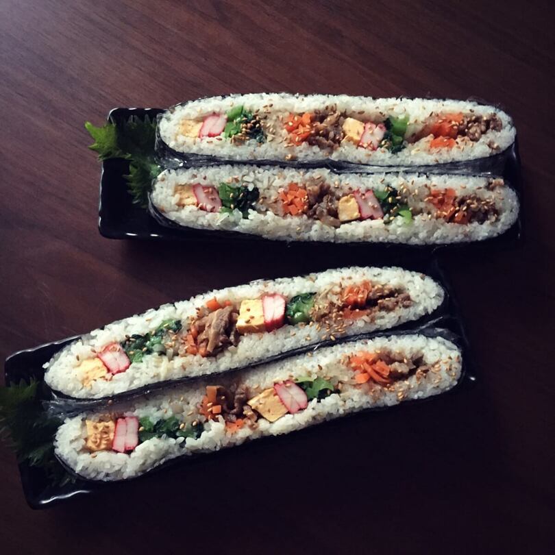 Kimieさんはキンパの具材をサンドし「キンパ風おにロング」にアレンジ!ご飯は少しかために炊いて、塩、胡麻、胡麻油で味付けしているんだそう。野菜、お肉、卵とバランス良く入っているので、1本で満足度が高いのも魅力的なポイントです。