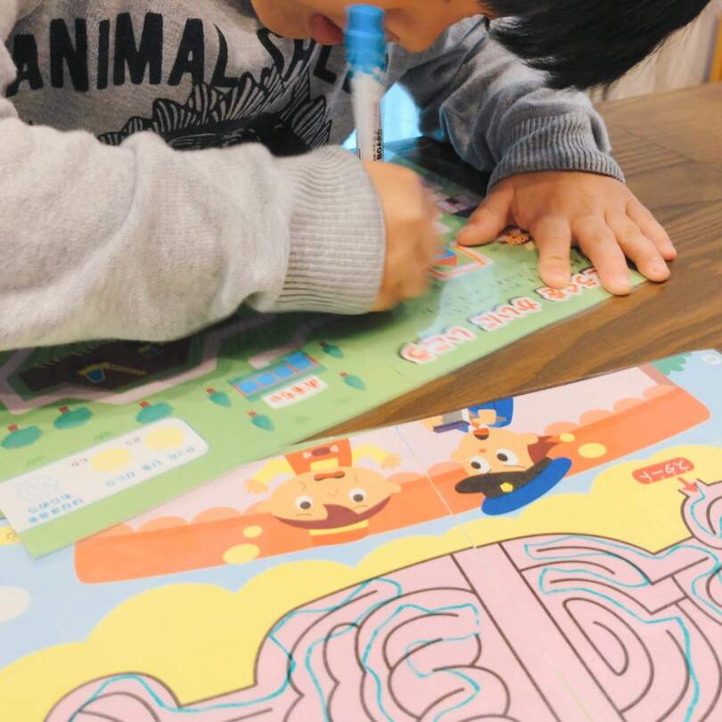 こちらもダイソーで購入したホワイトボード用のマーカーでいざ開始!めいろ大好きな長男は張り切って進めていきます。