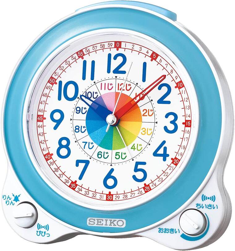すっきりと爽やかなデザインで見やすい目覚まし型の知育時計。時間別に色分けされたサークルと、穴が開いた針で文字盤が見やすく、子どもの学習をサポートしてくれます。音量のレベルや音が選べるほか、ひらがな表記なので操作がわかりやすいのもうれしいポイント。こちらもスヌーズ機能付きです。