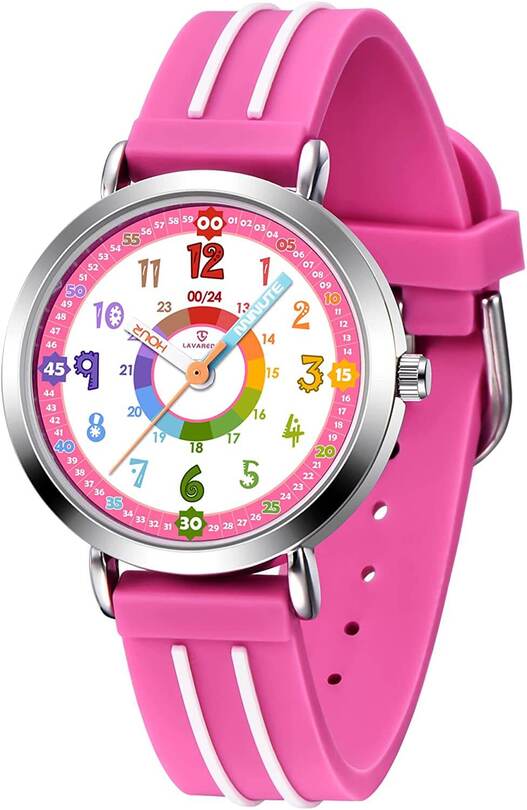 白地にピンクカラーと可愛い文字盤が可愛い知育腕時計。知育時計らしさを感じさせないデザイン性の高さは、おしゃれにこだわるキッズにおすすめです。こちらも生活防水仕様なので普段使いに最適。シリコンベルトは5歳から16歳くらいまでに対応しているので、長く使えます。