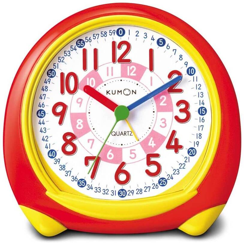 赤と黄色の元気カラーが、子ども部屋にもぴったりな目覚まし型知育時計。赤が時間、青が分と、シンプルに色分けされた文字盤は見やすく、時刻を理解しやすい仕様になっています。アラーム設定用の針も色分けされているので、目覚まし操作もスムーズ。二度寝防止のスヌーズ機能付きです。