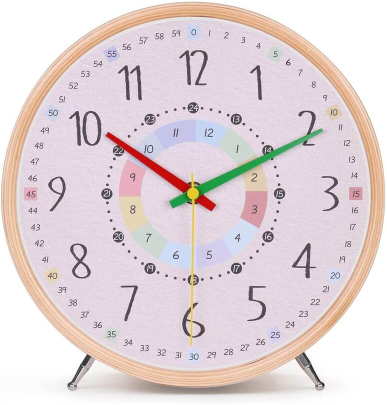クレヨンで描かれたような文字盤が可愛い置き型の知育時計。1時間毎の色分けと、24時間表記の補助数字、分単位も略さずに描かれています。あたたかみのある木枠と優しい色合いは、ナチュラルなインテリアにも似合いそう。