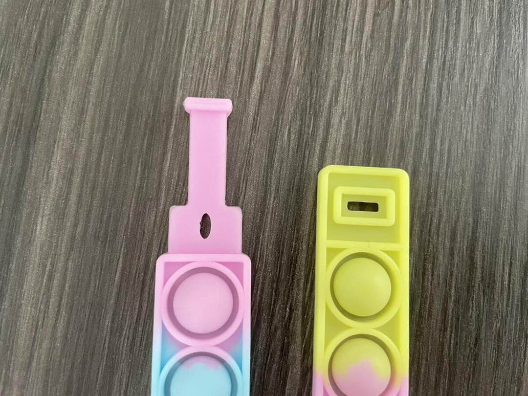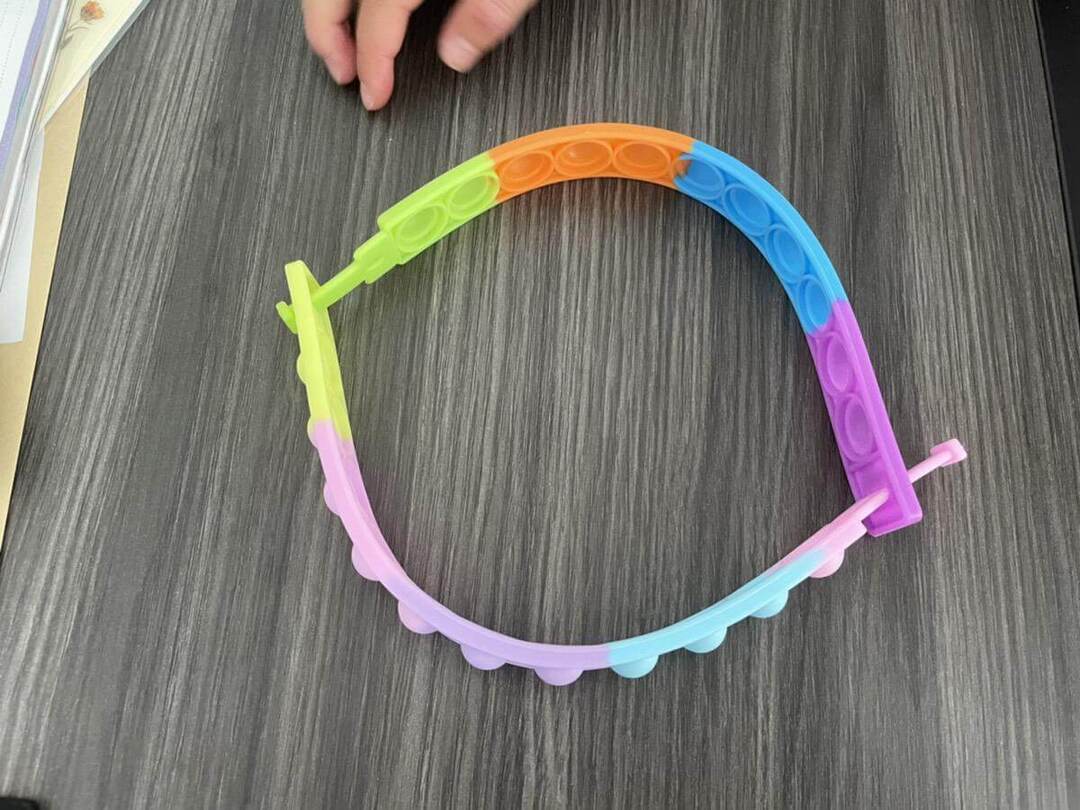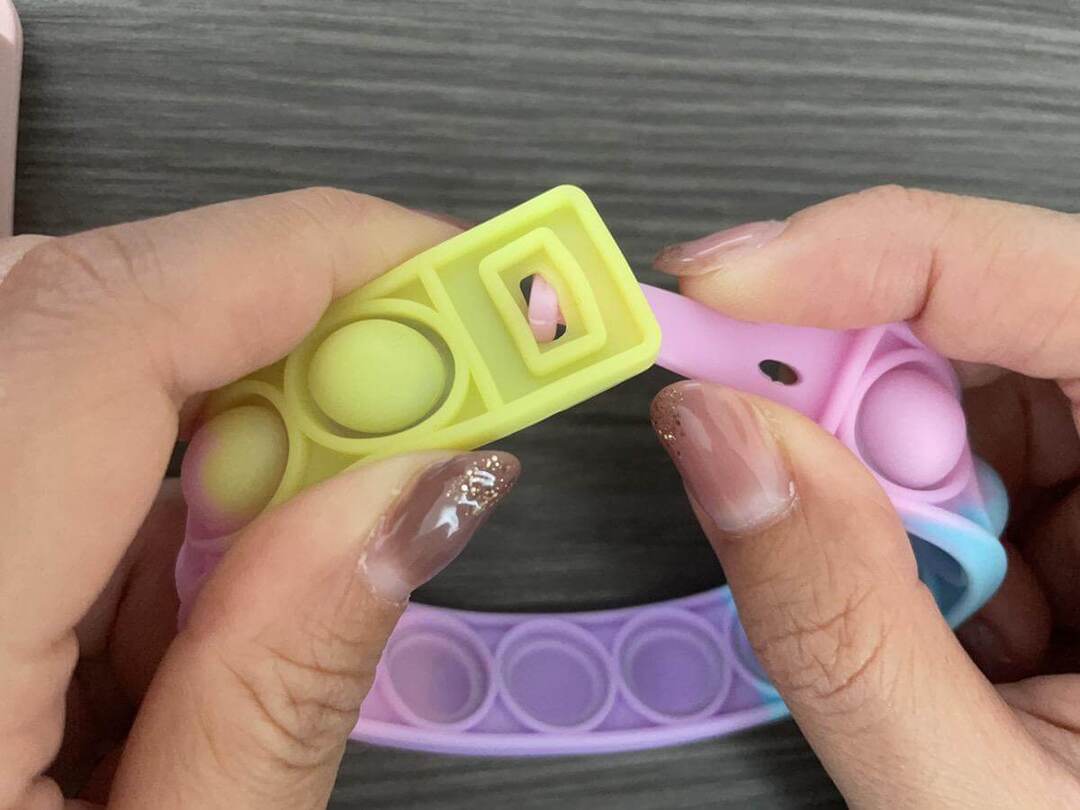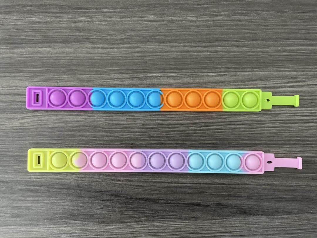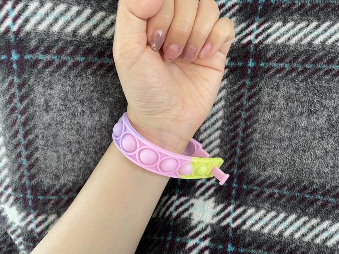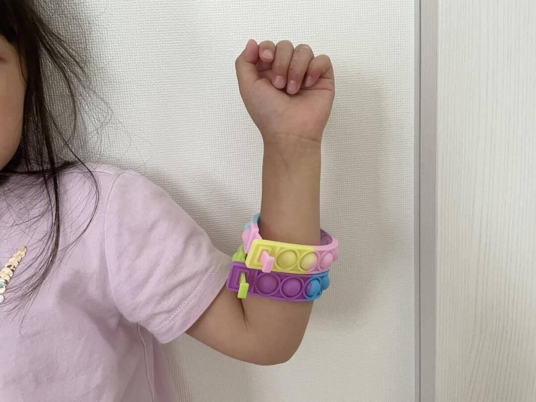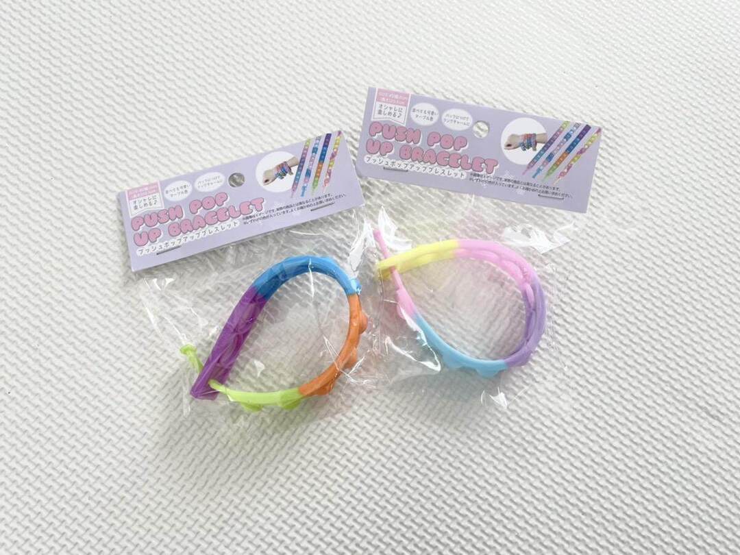 キャンドゥのプッシュポップアップブレスレット。子どもの腕にはちょっと大きすぎるサイズ感が残念ポイントでしたが、ほかのプッシュポップに比べてコンパクトなので、かさばらずに持ち運びできるアイデア商品です。