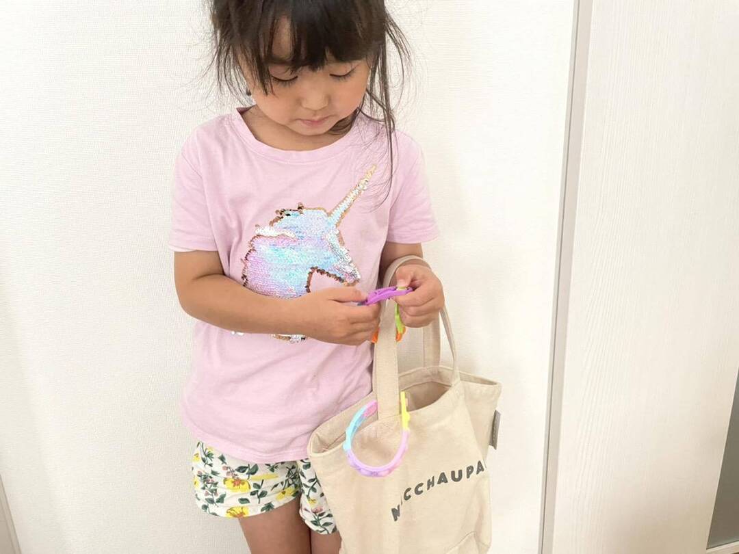 ブレスレットとしては大きすぎたので、バッグの持ち手に取りつけてみました☆すると「こっちの方がプチプチしやすいし良いかも!」と娘も気に入った様子。