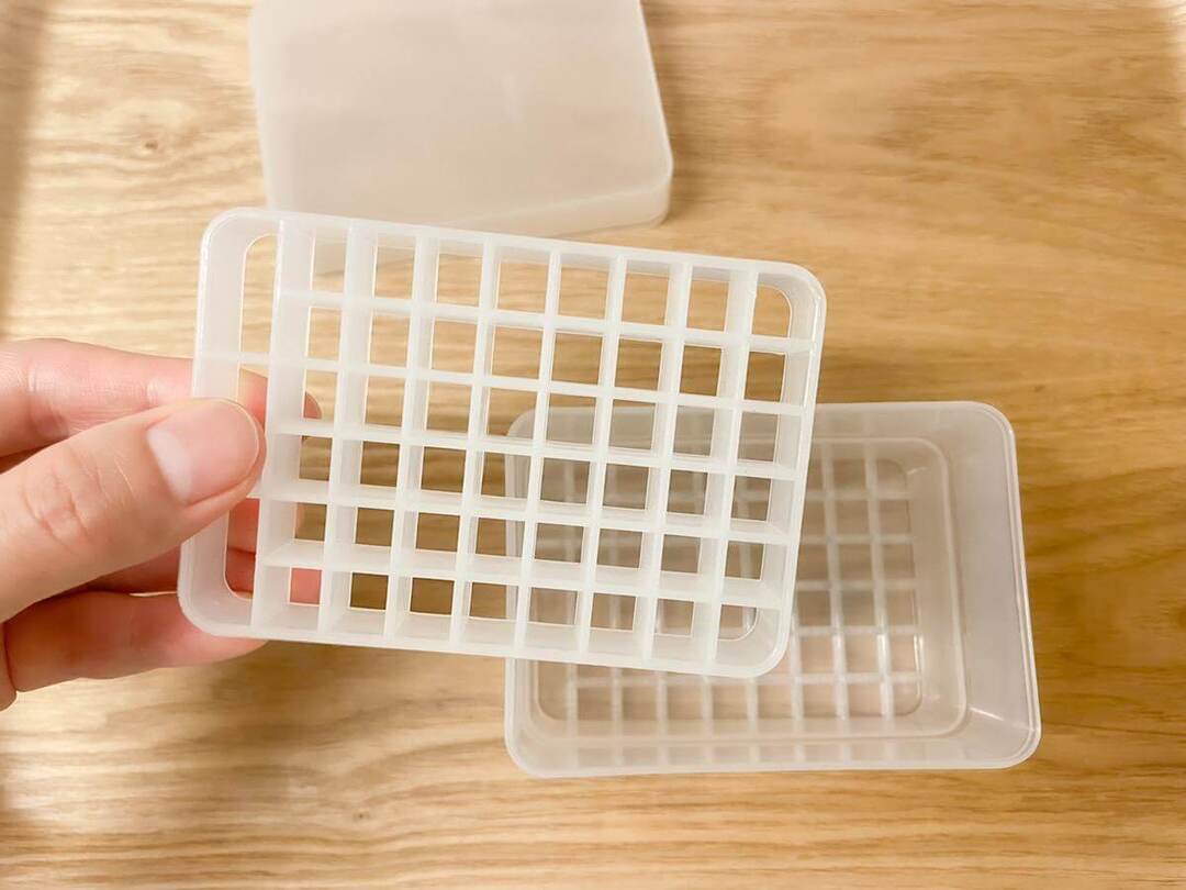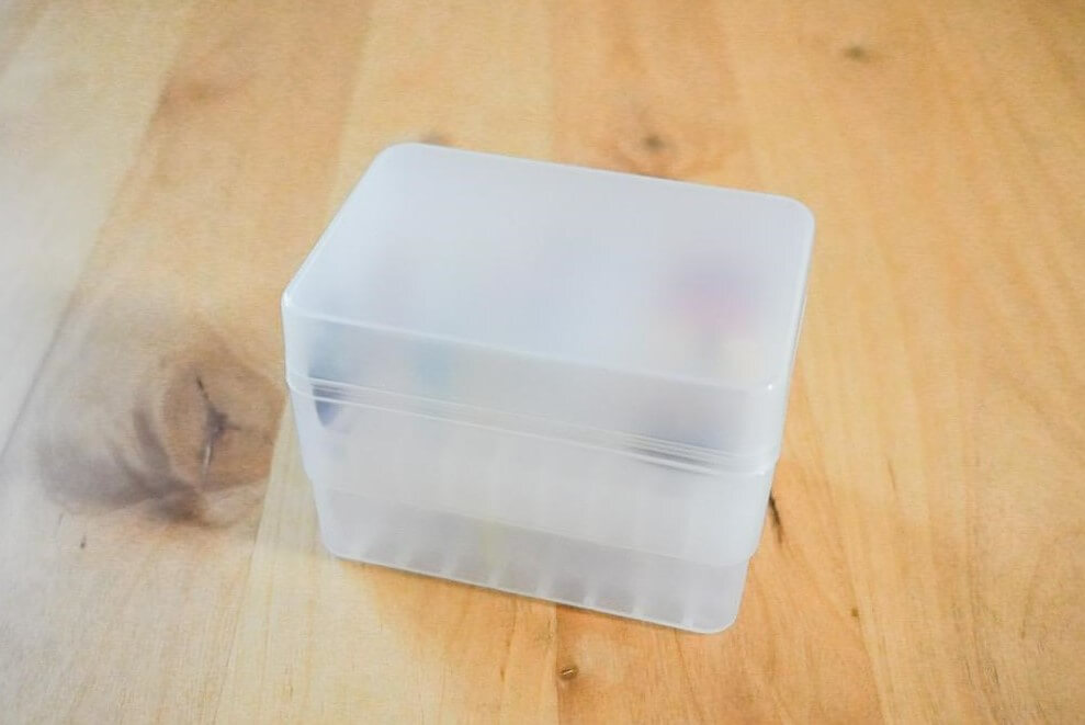 こちらがセリアの「ランチピックスケース」(110円・税込)です。ケースの大きさは縦70mm×横100mm×高さ70mmと四角いブロックのような感じ。