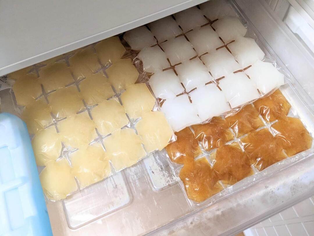 中身が出てしまう恐れがあるため、完全に凍るまでは上に物を置くことができませんが、凍らせてしまえば重ねて保管できます!ポリ袋なので非常に薄く、省スペースでストックできるところもうれしいポイントですね♪