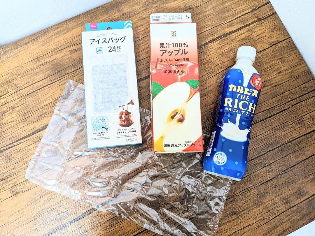 準備するものは、アイスバッグと凍らせたい飲み物など。今回は、娘がこよなく愛するリンゴジュースと、私の好きな「カルピス・ザ・リッチ」を凍らせてみました☆