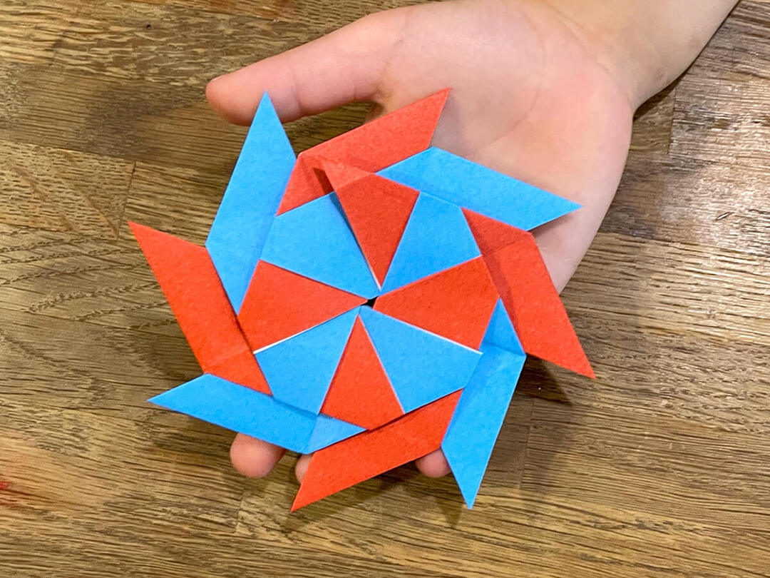 折り紙で作る手裏剣は定番ですが、こちらは8枚の折り紙を使った変形する手裏剣です。一般的な15cm角の折り紙の1/4サイズの紙で作ると、子どもの手のひらサイズになりますよ。