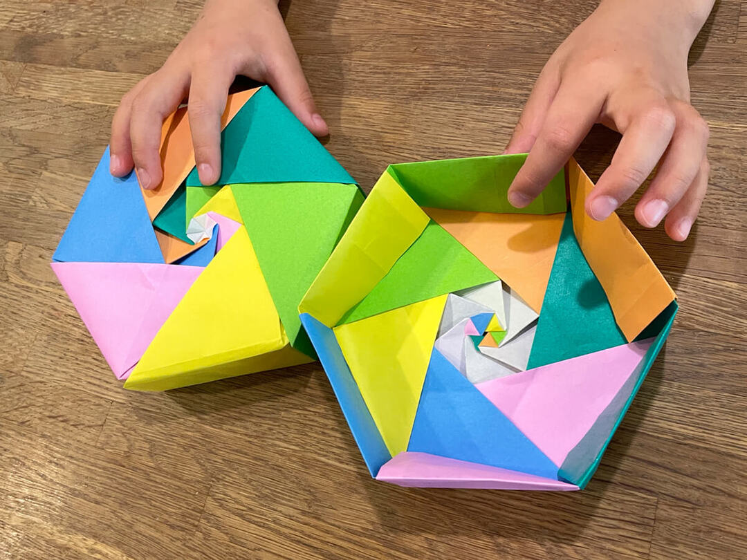 渦巻き模様が美しい6角形箱は、ふたと受け皿、各6枚ずつ計12枚の折り紙で作ります。折り方も複雑なところはないので、幼児でも楽しめそうです。