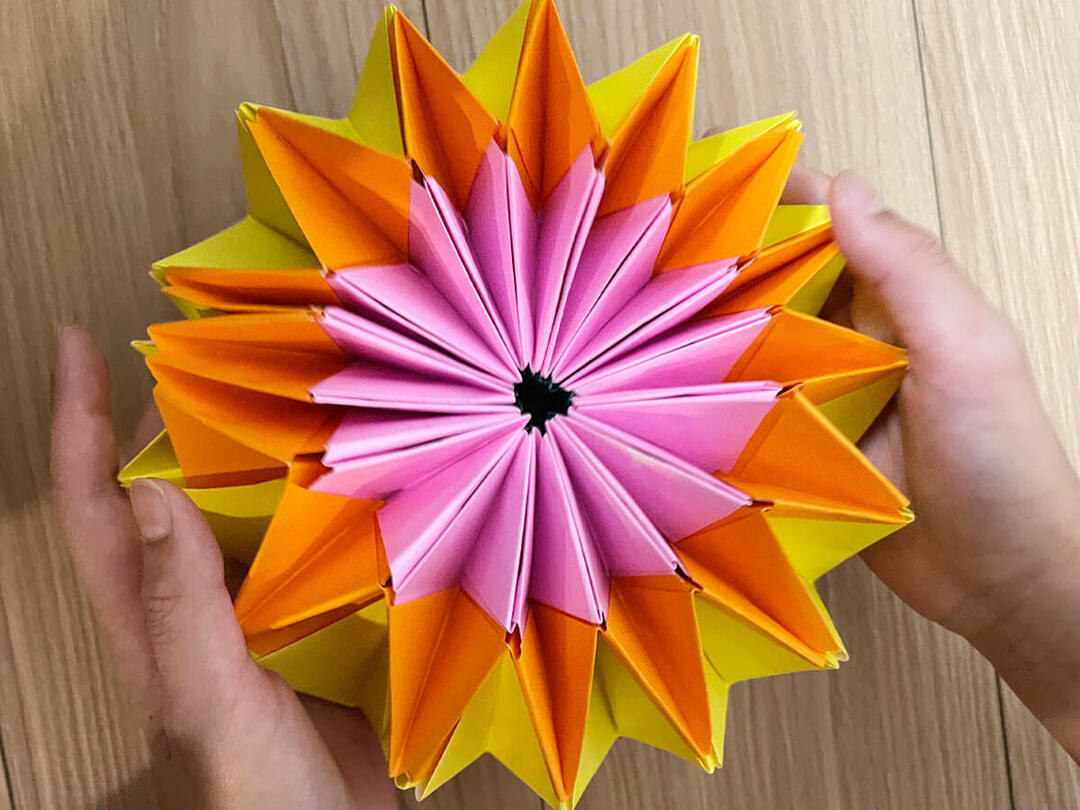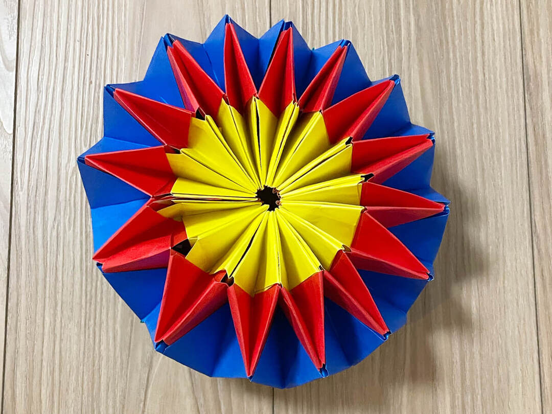 折り紙の角に手をかけて、くるくると回転させると内側からどんどん新しい色が見えてくる、折り紙の万華鏡。一度は作ってみたいという人も多い、大作折り紙の定番です。