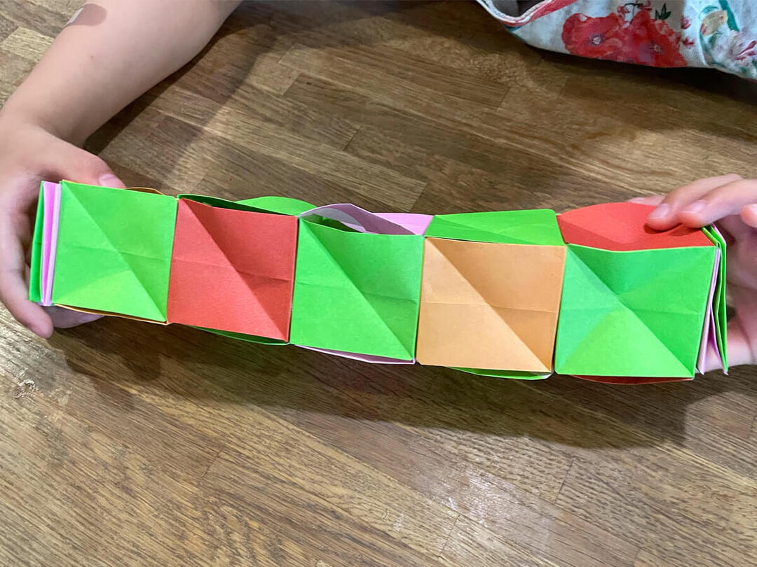 作り方は15cm角の折り紙で2種類の部品を作りパーツを作ります。画像では、パーツを7セットつなげています。パーツは7セットでなくても短いもの、長いものなどあっても遊べますよ♪