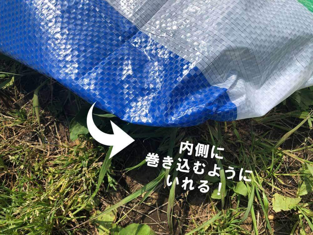 つぎに、結んだ箇所を内側に巻き込むように入れてください。四隅すべて完了したら、飛ばされにくいレジャーシートの完成です♪