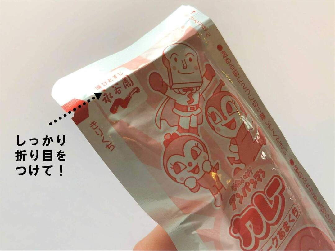 やり方はとっても簡単、袋の「切り口」部分に沿って折り目をつけるだけです。ポイントは、爪や指の腹を使ってしっかり折り目をつけること!