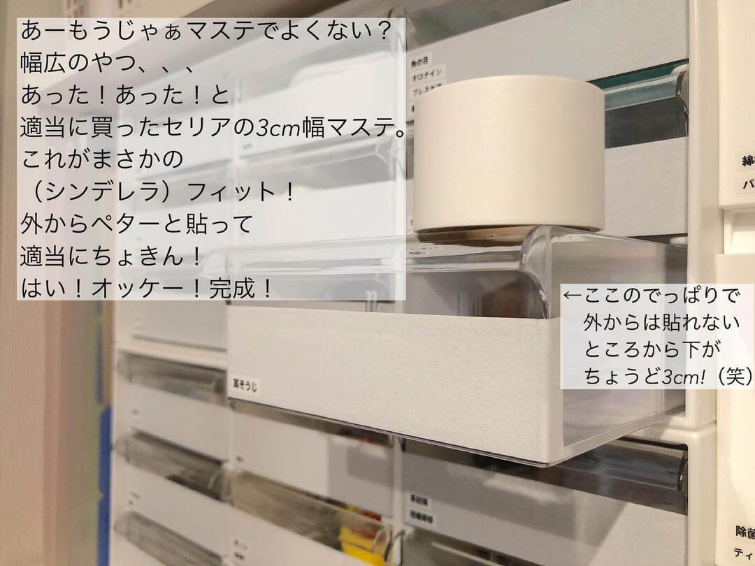 そして、透明の引き出しは、中身が見えるのがよいところであり、ごちゃつくのが気になるところでもあり…。そんな問題はマステを貼ることで解決!セリアの幅広のマステを外側からペタっと貼れば、ほどよい目隠しになり、前から見た時もすっきり!
