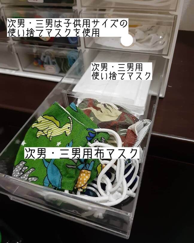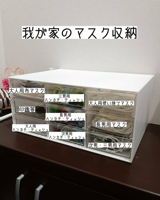 9つの引き出しがあれば、5人家族のマスクもそれぞれ収納でき、さらにハンカチやティッシュなどの置き場にも。