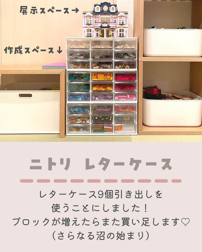 えりこさん宅では、ニトリのレターケースを3個重ねてレゴのパーツ収納に活用。