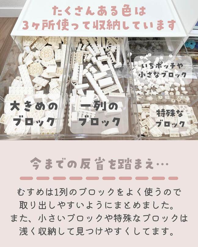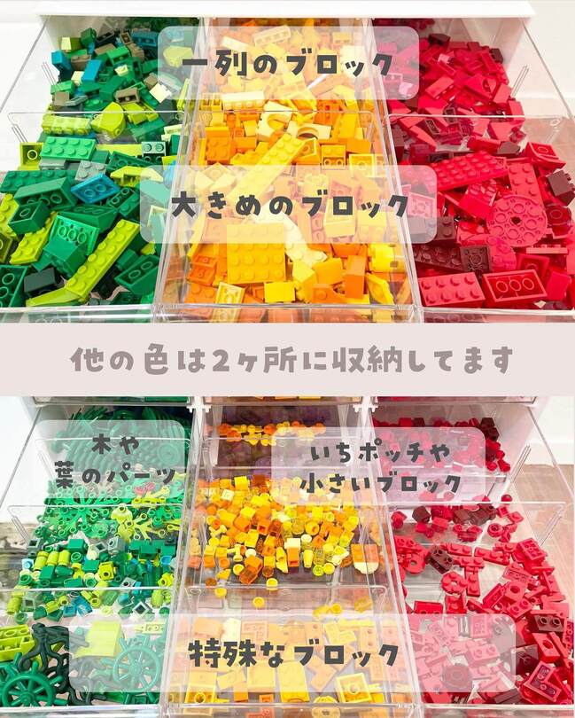 色で分け、さらに「大きめ」「一列」「特殊ブロック」「細かいブロック」に仕分け。