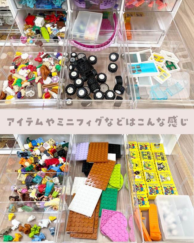 食べ物や雑貨などのアイテムも取り出しやすく、ミニフィグとレゴフレンズのドールも仕切りを使えば混ざりません!