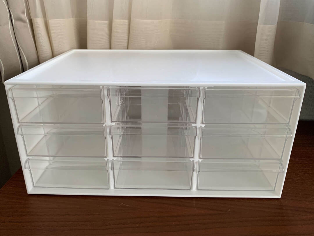机の上などで使うのに重宝するサイズ感で、封筒やハガキなどを収納するのにぴったりの引き出しが9個ついています。引き出しは透明で、中に何が入っているかが一目瞭然!
