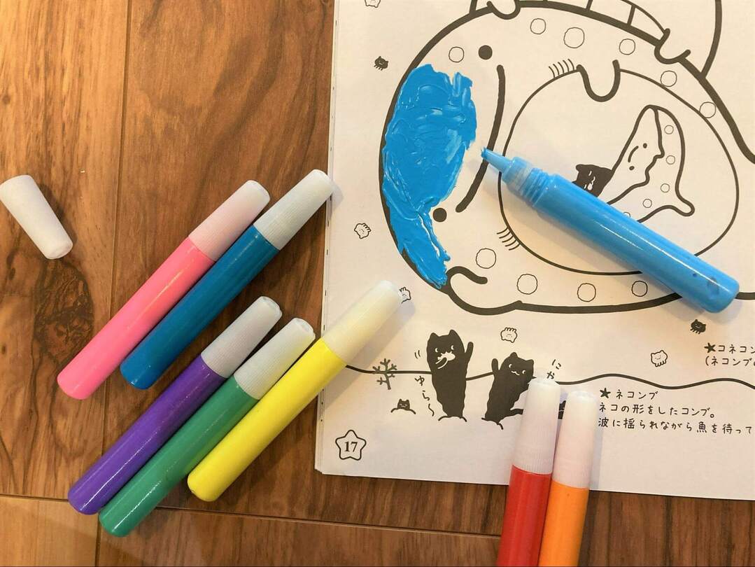 娘は「ペン」と聞いて、塗り絵をやってみたかったようですが、粘度が高いため塗るのに四苦八苦…。きれいに塗ることができませんでした。幅広い色塗りというよりも、文字や絵を描くほうが向いていそうです。